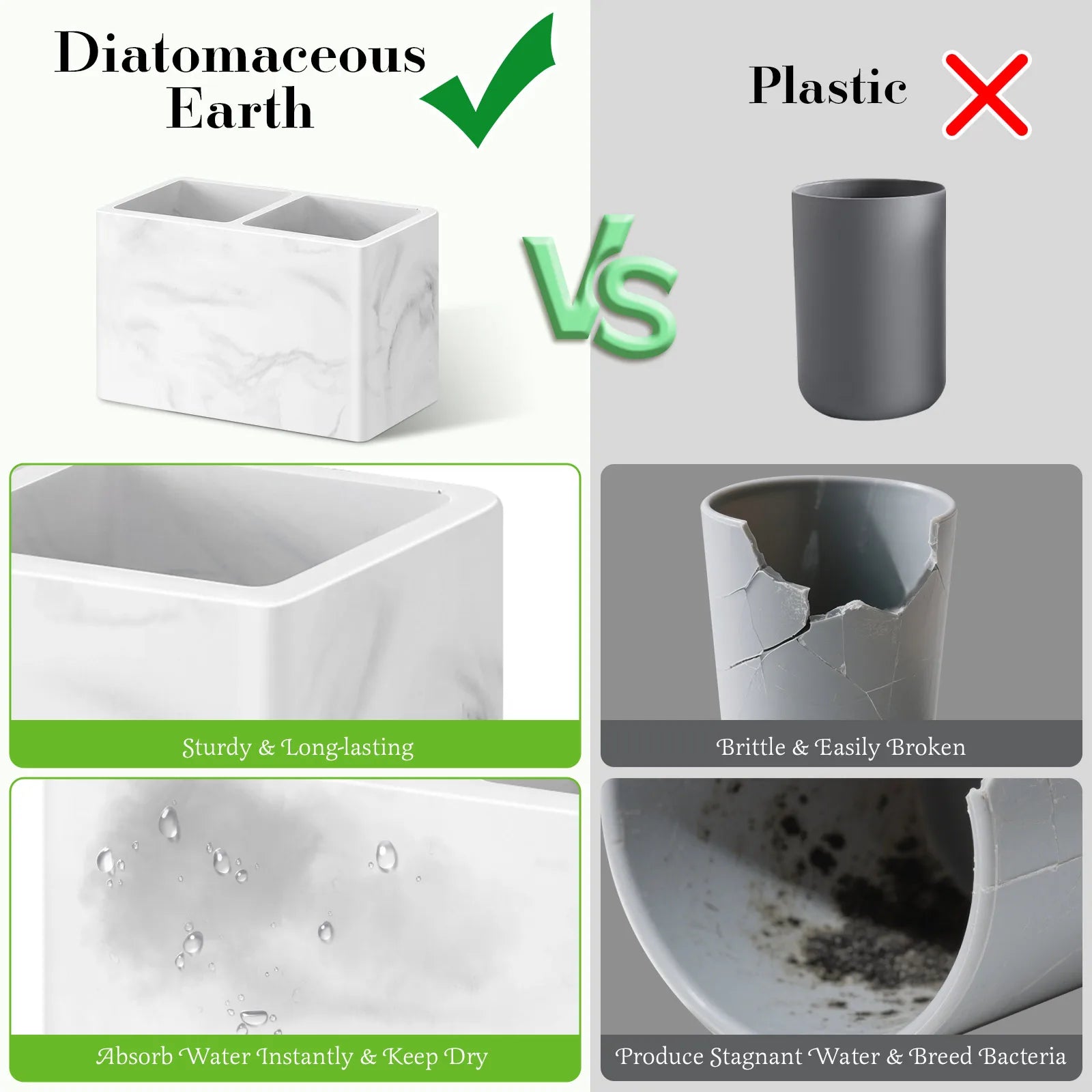The porous structure of the diatomaceous earth toothbrush holder lets it absorb water and dry quickly. Our electric toothbrush holder won't harbor bacteria due to water accumulation and is great for keeping your toiletries dry and hygienic.